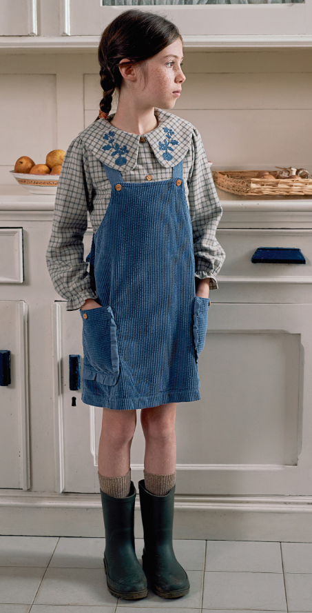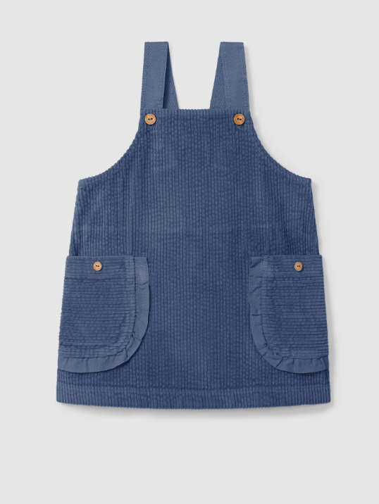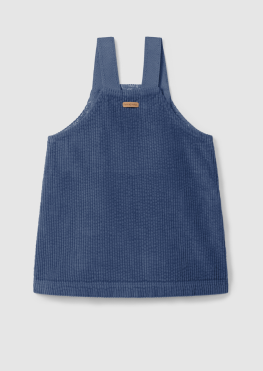 Abito scamiciato in velluto a coste 100% cotone con tasche frontali funzionali e dettaglio arricciato con bottoni decorativi. Chiusura con bottoni Laranjinha in legno in due posizioni sulle spalline 100% COTONE...