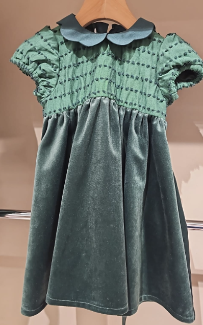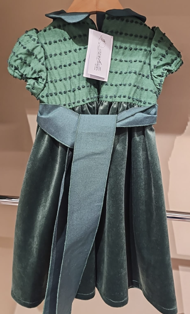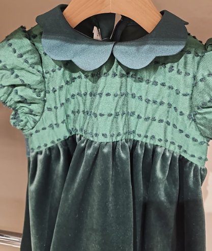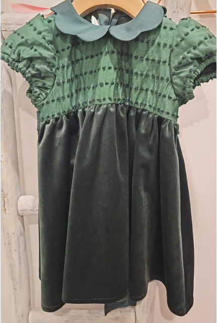 Abito verde fluido con collo a corolla, realizzato in tessuto fluido. la vita é definita da una cintura in taffetà, aggiunge un tocco di eleganza