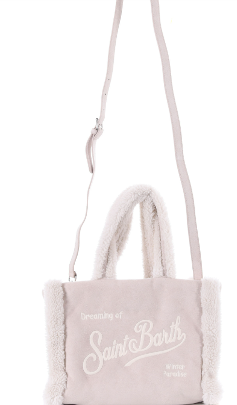Shopping MC2 Saint Barth in simil camoscio color rosa. Logo frontale ricamato. Profili in ecomontone bianco. Due manici morbidi con inserti in ecomontone. Tracolla removibile. Chiusura con bottone.