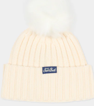 Berretto avorio a costine, con risvolto e pompon; é decorato con scritta Favolosa sulla parte anteriore e patch logato sul retro.