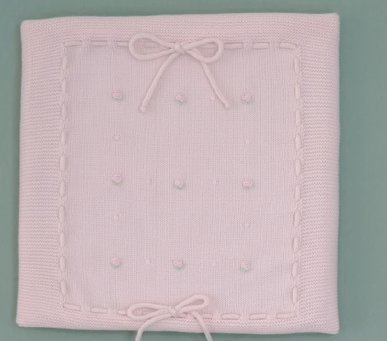 coperta in lana, colore rosa, con dettaglio delle rose ricamate a vapore