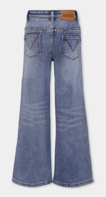 Jeans denim cinque tasche, in misto cotone organico, chiusura frontale con bottone e zip, passanti per cintura e vita regolabile grazie ad elastico interno con bottoni. Sono decorati con strass sulla...