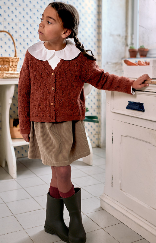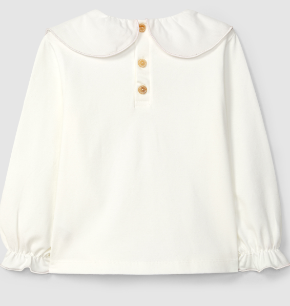 Maglia a maniche lunghe in morbido jersey di cotone spazzolato. Collo e polsini con volant e dettagli ricamati. Chiusura con bottoni Laranjinha sul retro. 97% COTONE3% ELASTAN