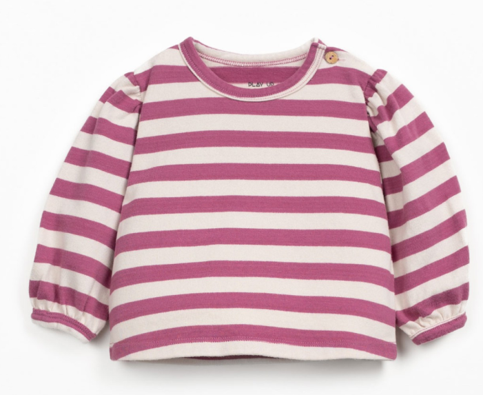 Questo maglione è realizzato in tessuto jersey con un mix di cotone biologico e cotone riciclato, di colore rosa. Ha maniche lunghe, un'apertura sulla spalla con un bottone in cocco e...