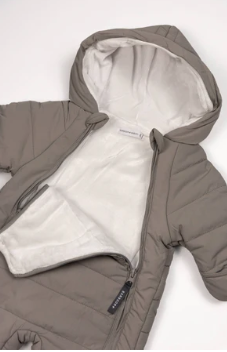 Interno in velluto di bambu, tessuto di origine naturale e traspirante Esterno in poliestere riciclato, resistente a vento e pioggia Doppia cerniera per una vestizione semplice e veloce  Risvolti su maniche...