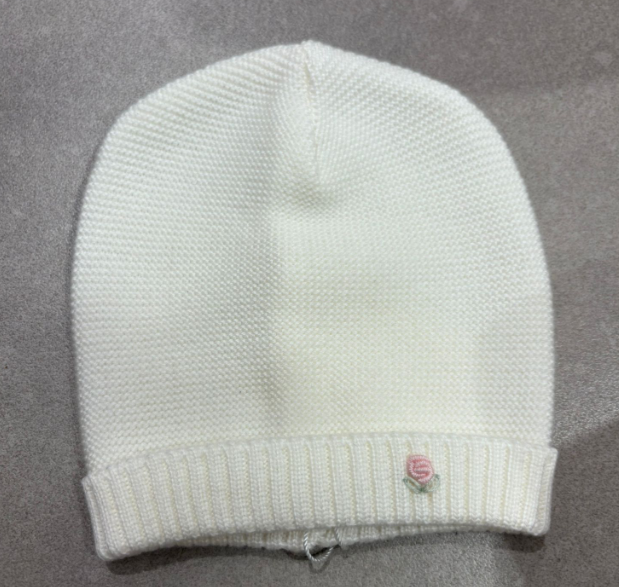 cappello in lana panna con rosellina rosa ricamata a vapore