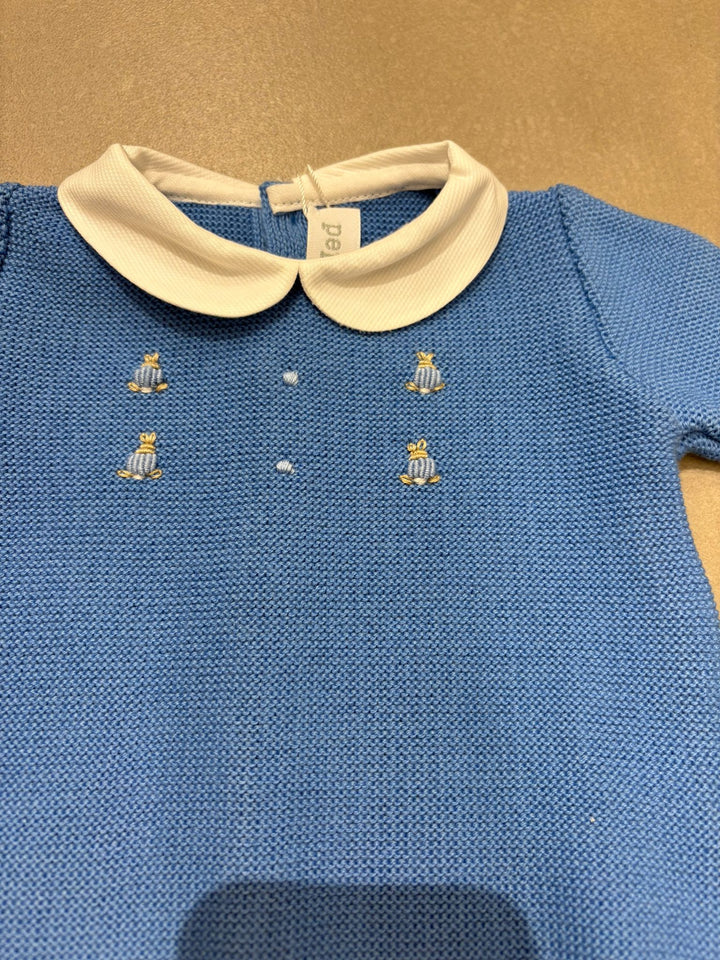 Completo 2 pezzi in lana azzurro con coniglietti ricamati a vapore