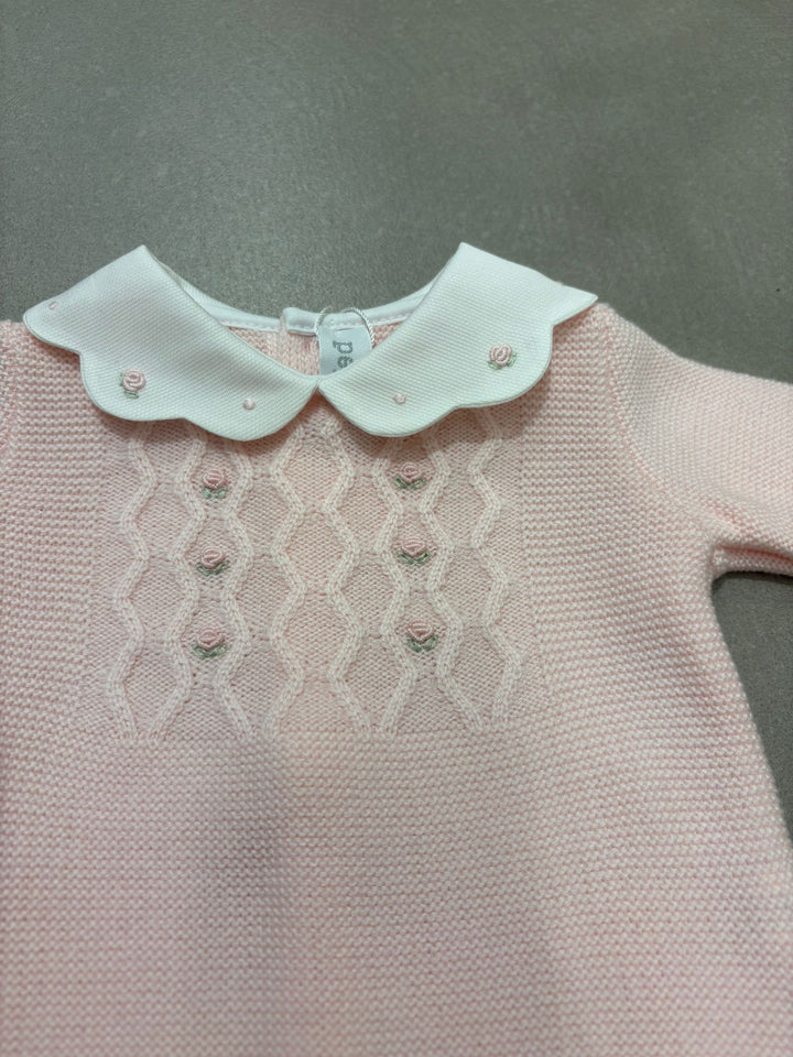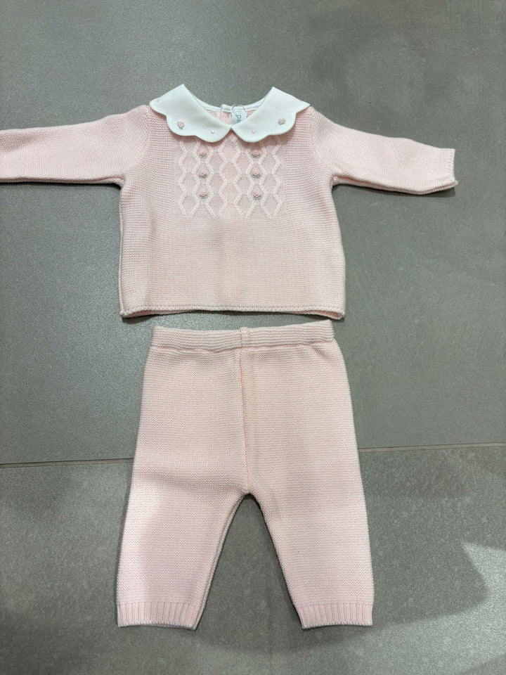 completo 2 pezzi in lana, colore rosa, con roselline ricamate a vapore