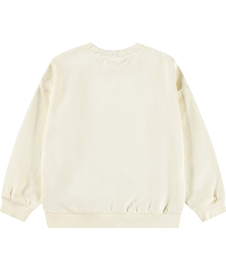 Felpa bianca in cotone biologico. La felpa ha una vestibilità ampia, scollo rotondo, bordi a coste e una stampa di un simpatico vestito gatto.