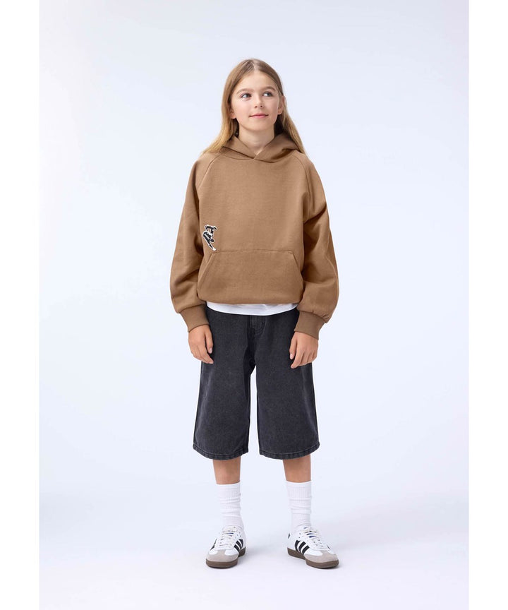 Felpa marrone con cappuccio in cotone biologico, con tasca a marsupio e polsini e orlo a coste. Questa felpa con cappuccio presenta una stampa in bianco e nero di skater e...