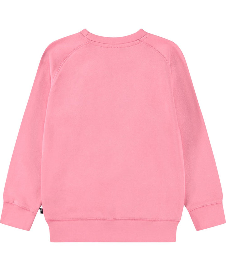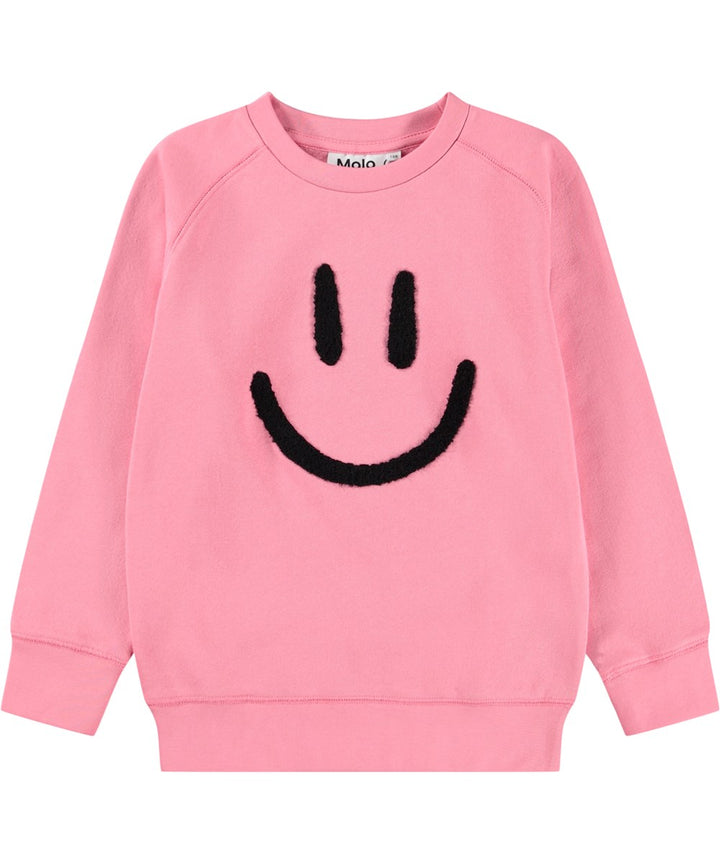 Felpa rosa in morbido cotone biologico con maniche raglan, bordi a coste su collo, maniche e vita. La felpa ha una vestibilità ampia e un ricamo nero con un sorriso sul...