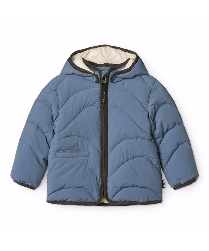 Giacca trapuntata blu idrorepellente per i più piccoli, realizzata in poliestere riciclato con fodera leggera e bordi marroni. La giacca ha un cappuccio staccabile, un collo alto, una cerniera con protezione...