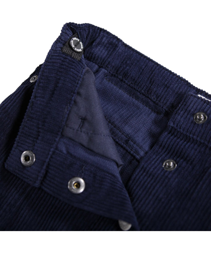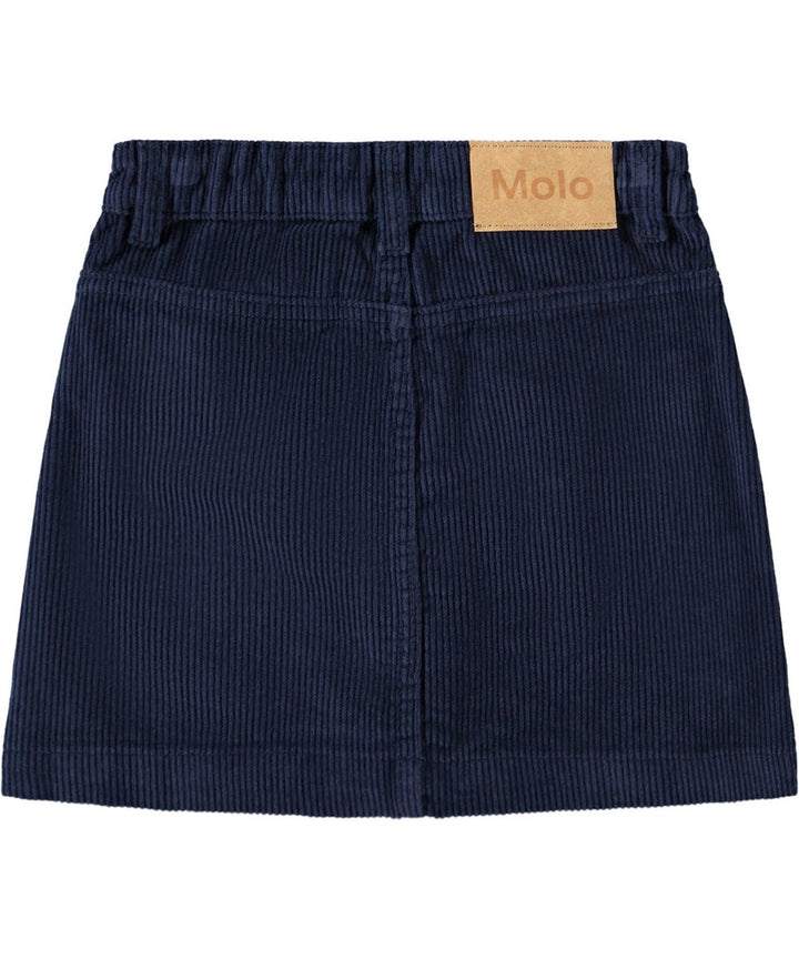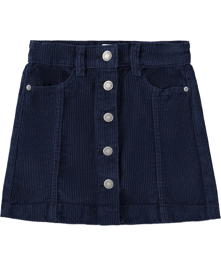 gonna in velluto a coste blu scuro con bottoni per la chiusura. La gonna arriva a metà coscia e ha una vita con passanti per cintura e tasche anteriori. Il bellissimo...