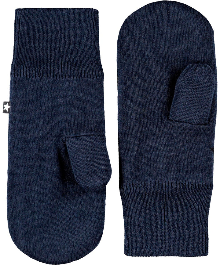 Guanti lavorati a maglia blu scuro con stelle nere. I guanti sono realizzati in morbido misto lana.