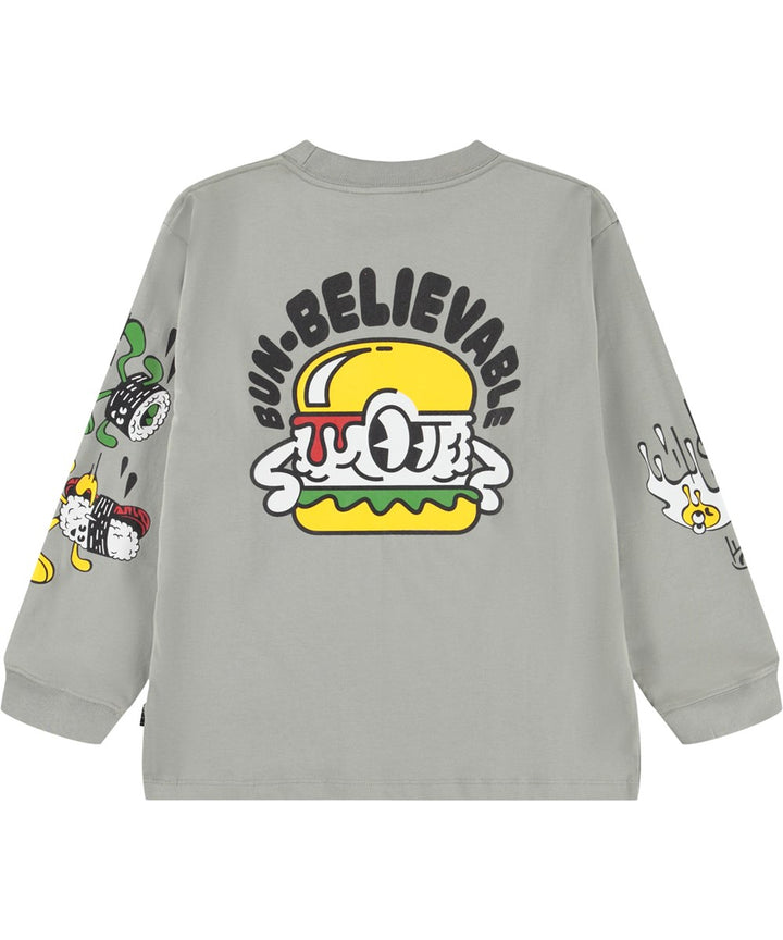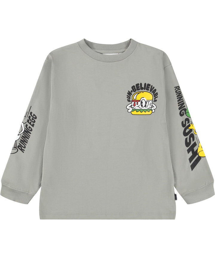 Maglia grigia a maniche lunghe in cotone biologico con scollo e maniche a costine. La maglia a maniche lunghe ha una vestibilità ampia e una stampa colorata con cibi vivaci e...