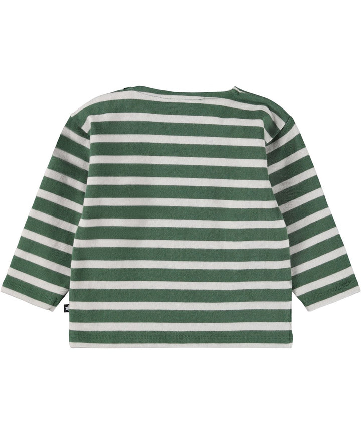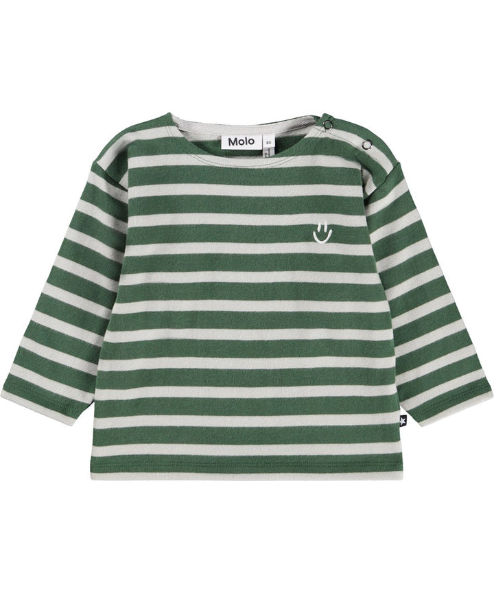 Maglia bretone a maniche lunghe per i più piccoli, realizzata in cotone biologico. La maglia a maniche lunghe presenta delle strisce verdi e un piccolo faccino sorridente bianco ricamato sul petto....