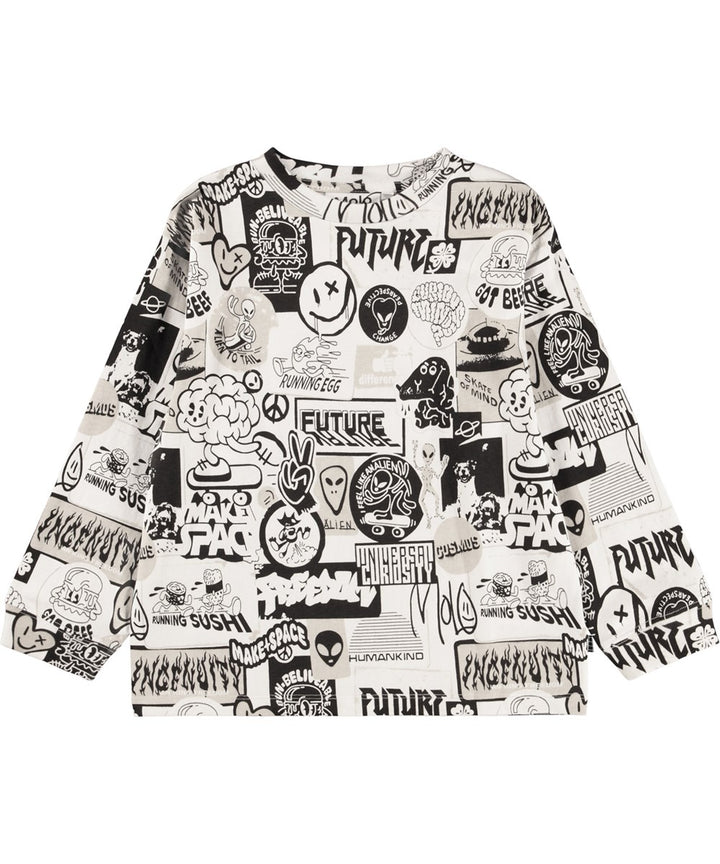 Maglia a maniche lunghe colore bianco sporco in cotone biologico con scollo e maniche a costine. La maglia a maniche lunghe ha una vestibilità ampia ed è decorata con stampe di...