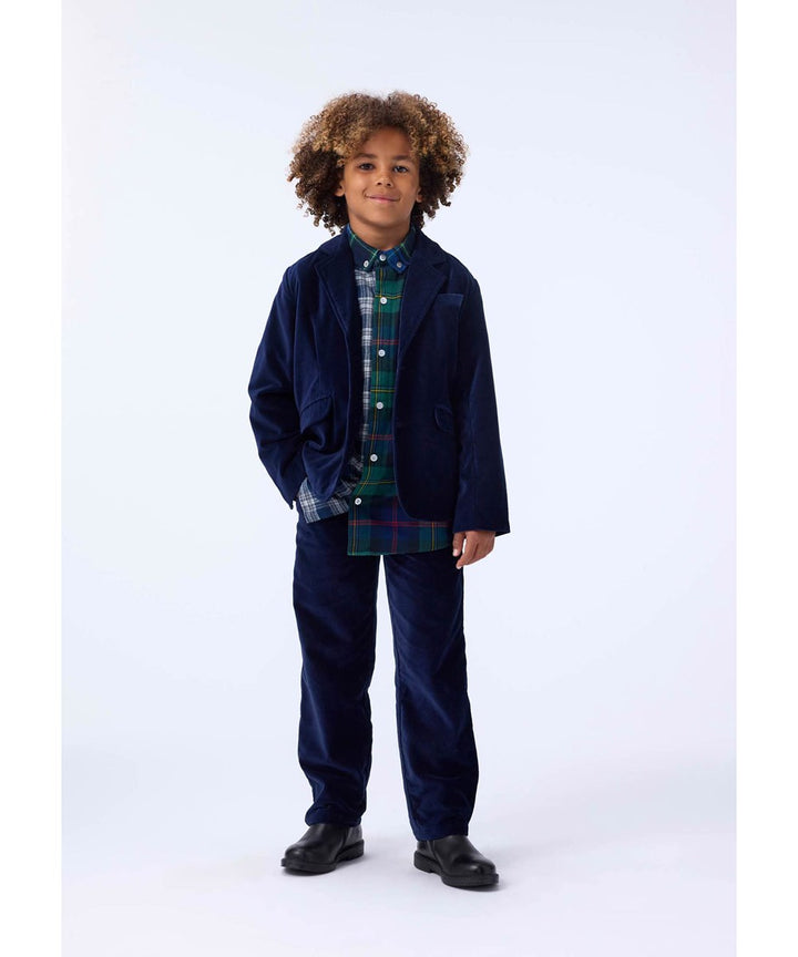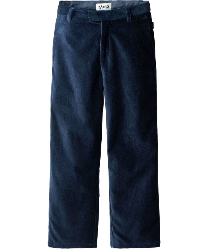Pantaloni da completo blu scuro in morbido velluto di cotone con quattro tasche, chiusura con cerniera, gancio e bottone. La cintura può essere regolata con un elastico interno per una vestibilità...