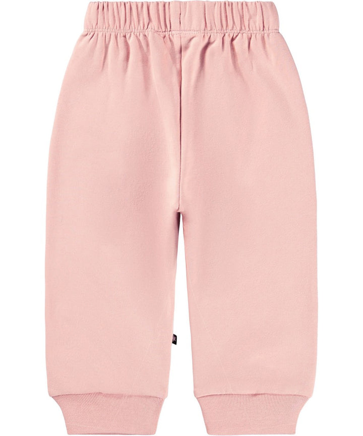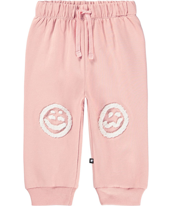 Morbidi pantaloni in cotone biologico per i più piccoli. I pantaloni sono rosa con delle morbide faccine bianche con diversi stati d'animo sulle ginocchia. I pantaloni hanno elastico e coulisse in...