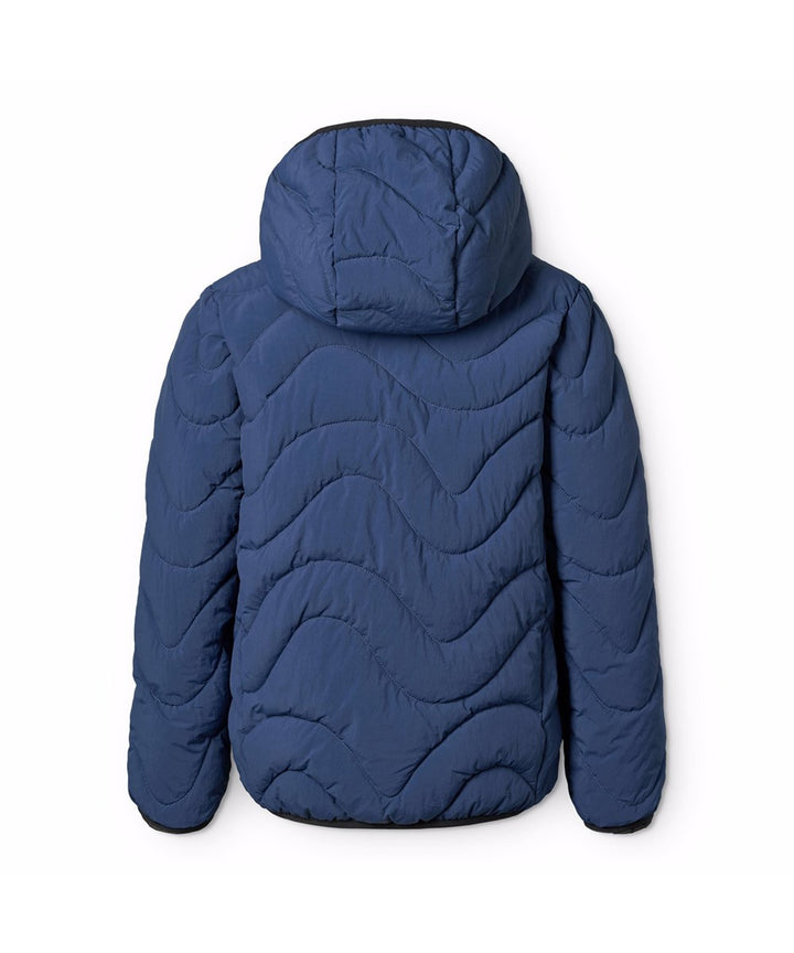 Piumino blu idrorepellente in nylon riciclato. Il piumino ha un cappuccio staccabile, un collo alto, una cerniera con protezione per il mento e tasche con cerniera sul davanti. Caratteristiche: resistente al...