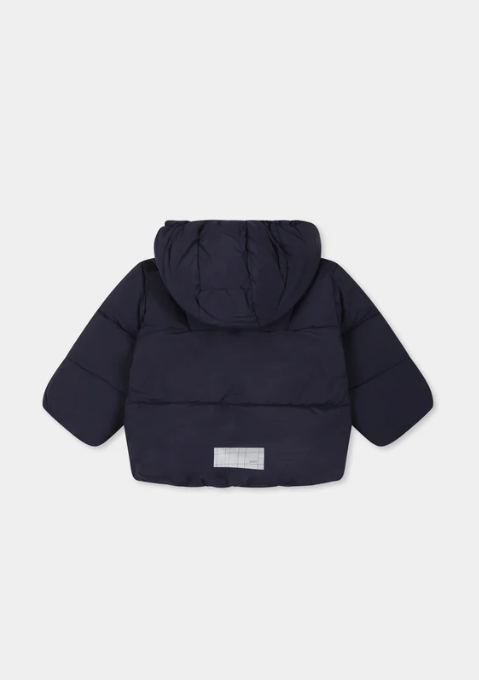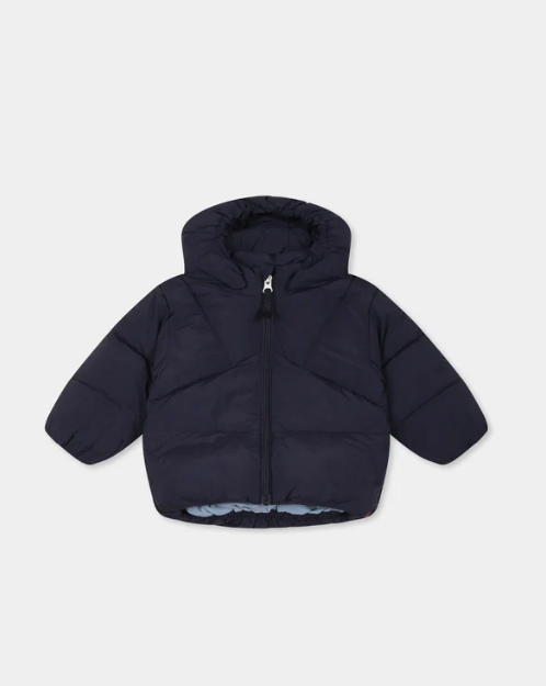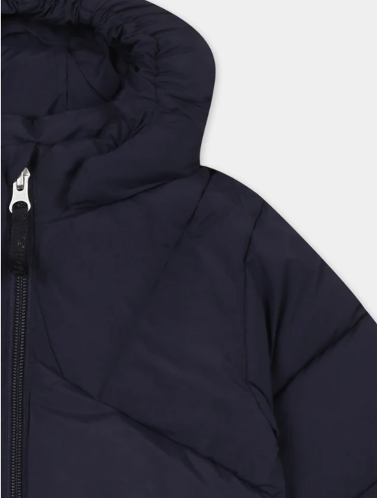 Piumino blu pesante, imbottito e trapuntato, a maniche lunghe, con cappuccio removibile, chiusura frontale con zip, tasche laterali, catarifrangente sul retro, polsini e orlo elaticizzati. È deocrato con patch logata sul...