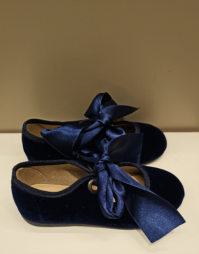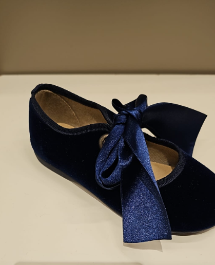 Scarpa ballerina in velluto blu , chiusura con fiocco di raso