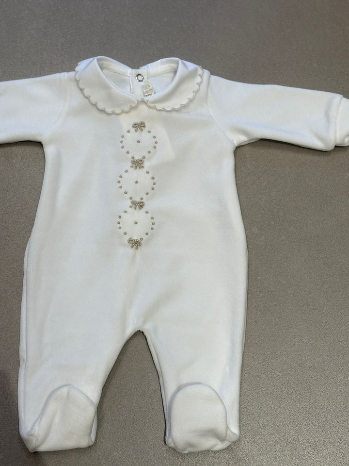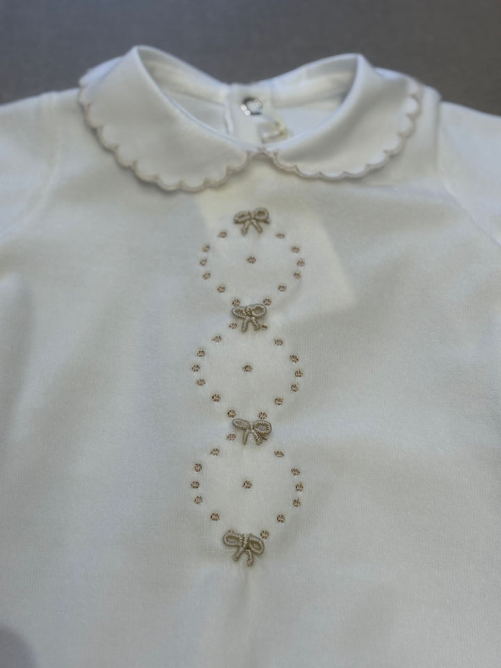 Tutina in ciniglia bianca con fiocchetti beije ricamati