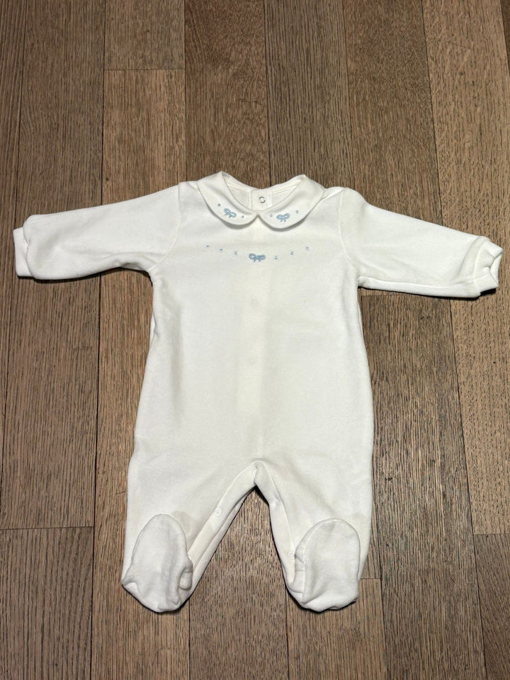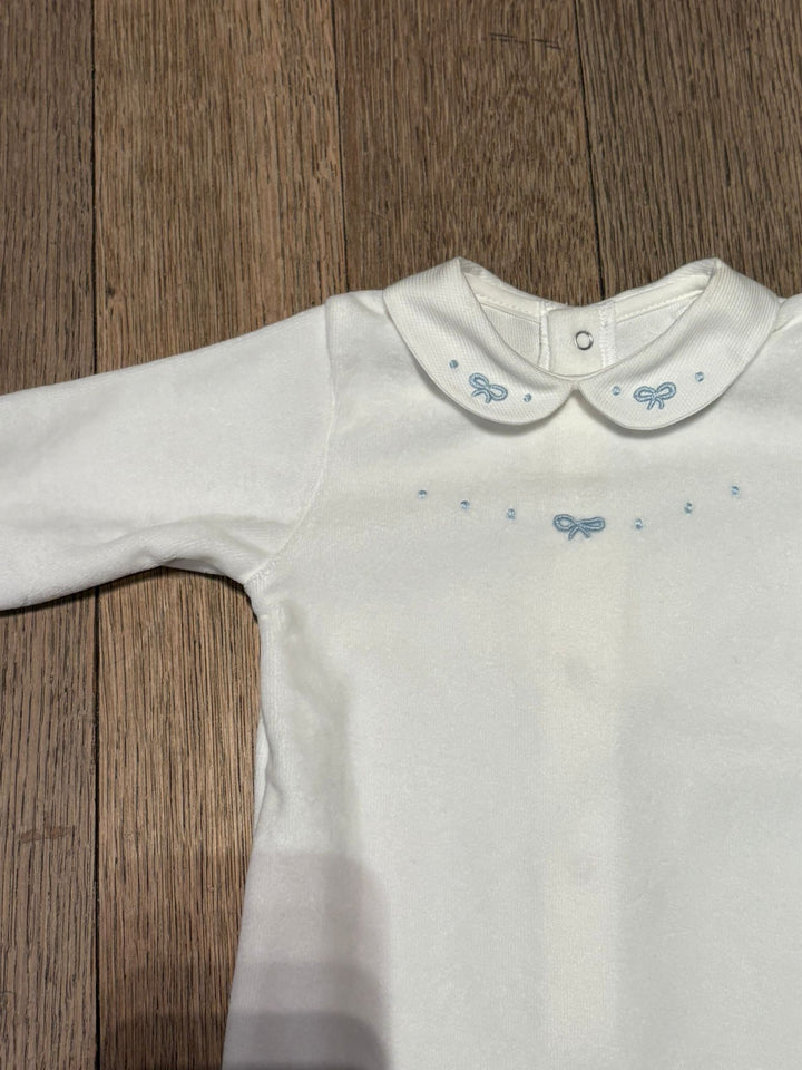Tutina in ciniglia bianca con fiocchetto celeste ricamato
