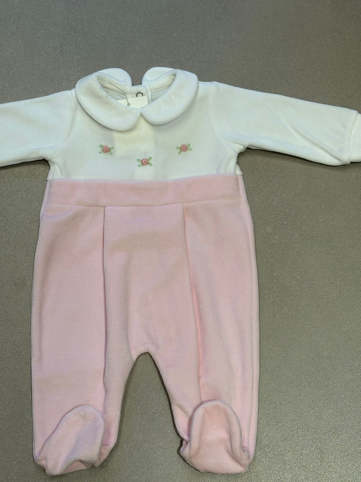 Tutina in ciniglia rosa con dettaglio roselline ricamate a vapore